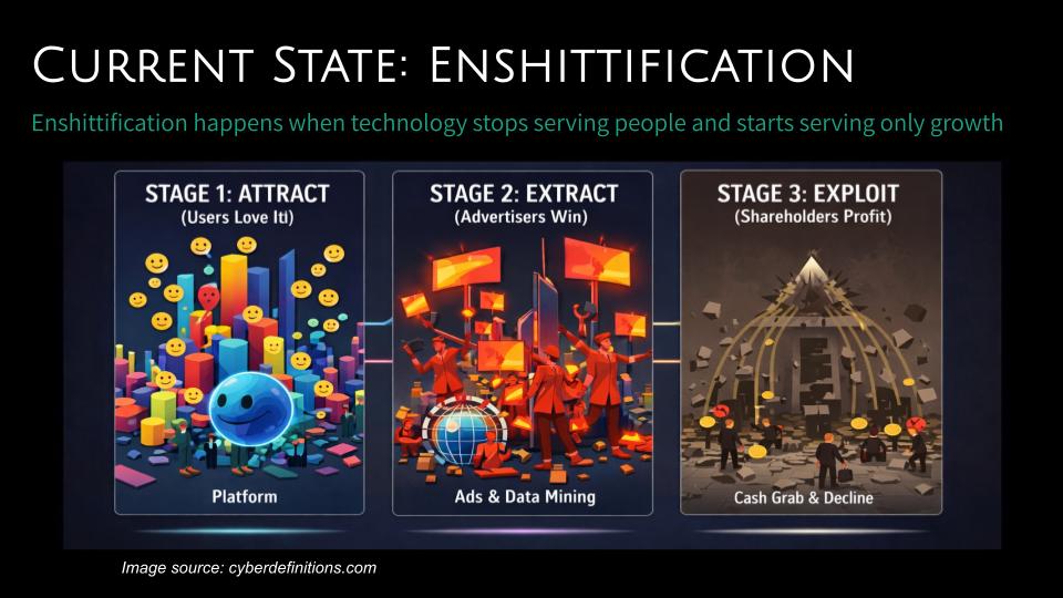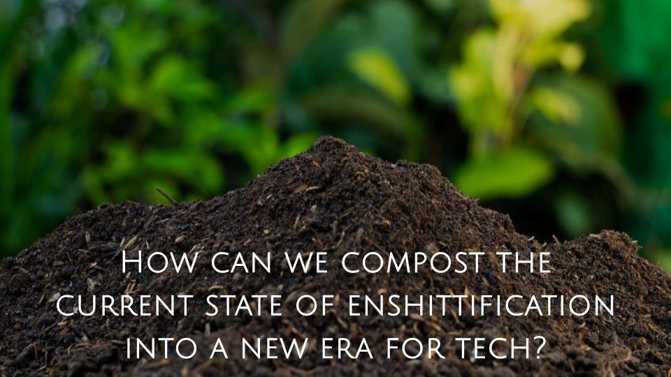 Enshittification has become the defining experience of modern technology. The “enshittification” cycle always seems to follow a pattern: digital platforms are great to users; then great to business customers; then extractive to everyone; features are hollowed out, things that once worked become brittle or break, and user experience becomes less user friendly and more hostile. Products that once felt and were useful, even liberating, slowly degrade into cluttered, extractive, manipulative systems. Platforms optimize against their users. Innovation narrows into monetization. Trust erodes. This extractive pattern has played out everywhere across the digital landscape. It is not accidental. It is the predictable outcome of technologies designed within extractive economic logic at their root: digital systems optimized for growth, control, and short-term returns, while externalizing social, ecological, and human costs. So, as this seed is, is this also how the fruit shall be? What is possible if breakdown isn’t the end of this story?